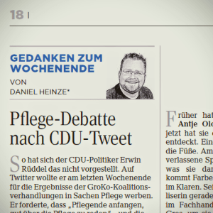 Krasse Geschichten und harte Kommentare, oder? Wenn auch nur die Hälfte der Tweets wahr ist, dann verdeutlicht das, was für ein Riesenproblem Deutschland auf dem Pflegesektor hat: viel zu wenig Personal, unterbezahlt, restlos überarbeitet. Und die sollen bitteschön „gut über Pflege“ reden? Wenn der Twitter-Patzer von Erwin Rüddel für etwas gut war, dann, dass er die Diskussion um die Pflege wieder ordentlich angeheizt hat. Der Politiker hat es tatsächlich geschafft, dass die Menschen über ihre Berufe erzählen – und die Gesellschaft aufrütteln. So wird deutlich, dass es mehr als lauwarme Kompromisse in Koalitionsverhandlungen braucht. Es braucht einen „großen Wurf”, der das Gesundheitssystem nachhaltig verbessert. Warme Worte und öffentlich bekundete Wertschätzung allein ändern nichts an einer Situation, an der sich ganz offensichtlich dringend was ändern muss.