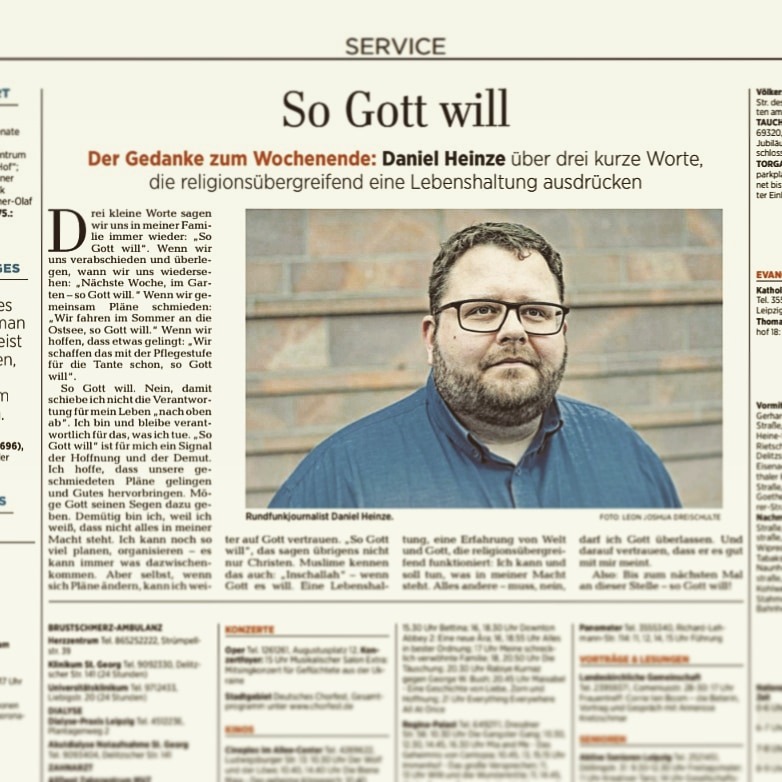 Drei kleine Worte sagen wir uns in meine Familie immer wieder: „So Gott will“. Wenn wir uns verabschieden und überlegen, wann wir uns wiedersehen: „Nächste Woche, im Garten – so Gott will.“ Wenn wir gemeinsam Pläne schmieden: „Wir fahren im Sommer an die Ostsee, so Gott will“. Wenn wir hoffen, dass etwas gelingt: „Wir schaffen das mit der Pflegestufe für die Tante schon, so Gott will“.