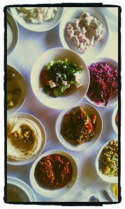 Israel und Palästina, so steht es in den Reiseführern, haben nicht wirklich eigenständige Küchen und nur sehr wenige „typische“, genuine Speisen. Dafür, so scheint mir, kommt hier nur das Beste aus dem Orient (arabische Bevölkerung) und aus aller Welt (jüdische Bevölkerung) zusammen und vermischt sich zu einer wirklich wunderbaren Patchwork-Cuisine. Lecker.