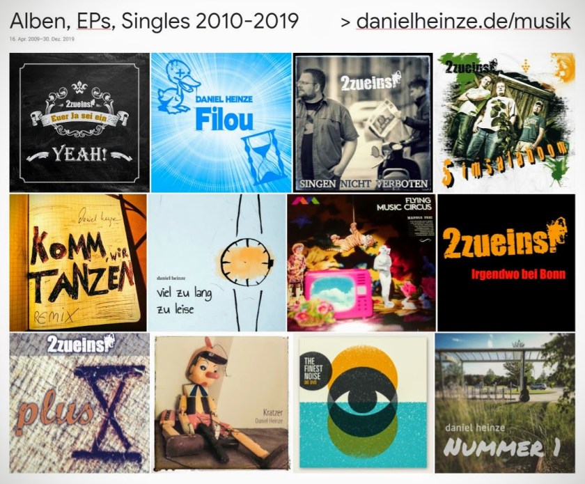 Eine Dekade geht zu Ende. Zehn Jahre, in der mich das Musikmachen konsequent begleitet hat. Vor allem und besonders gern natürlich mit 2zueins!, aber auch immer wieder auf Solopfaden. Lust, mal reinzuhören? Die Spotify-Playlist hier enthält (fast) alles, was ich musikalisch bisher so verzapft habe. Und hier gibt’s detaillierte Infos zu allen Veröffentlichungen.